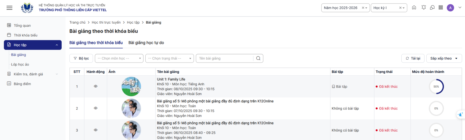Lưu ý: Trong quá trình xem bài giảng, học sinh có thể xem tiến độ hoàn thành của mình ngay bên cạnh tên bài học.