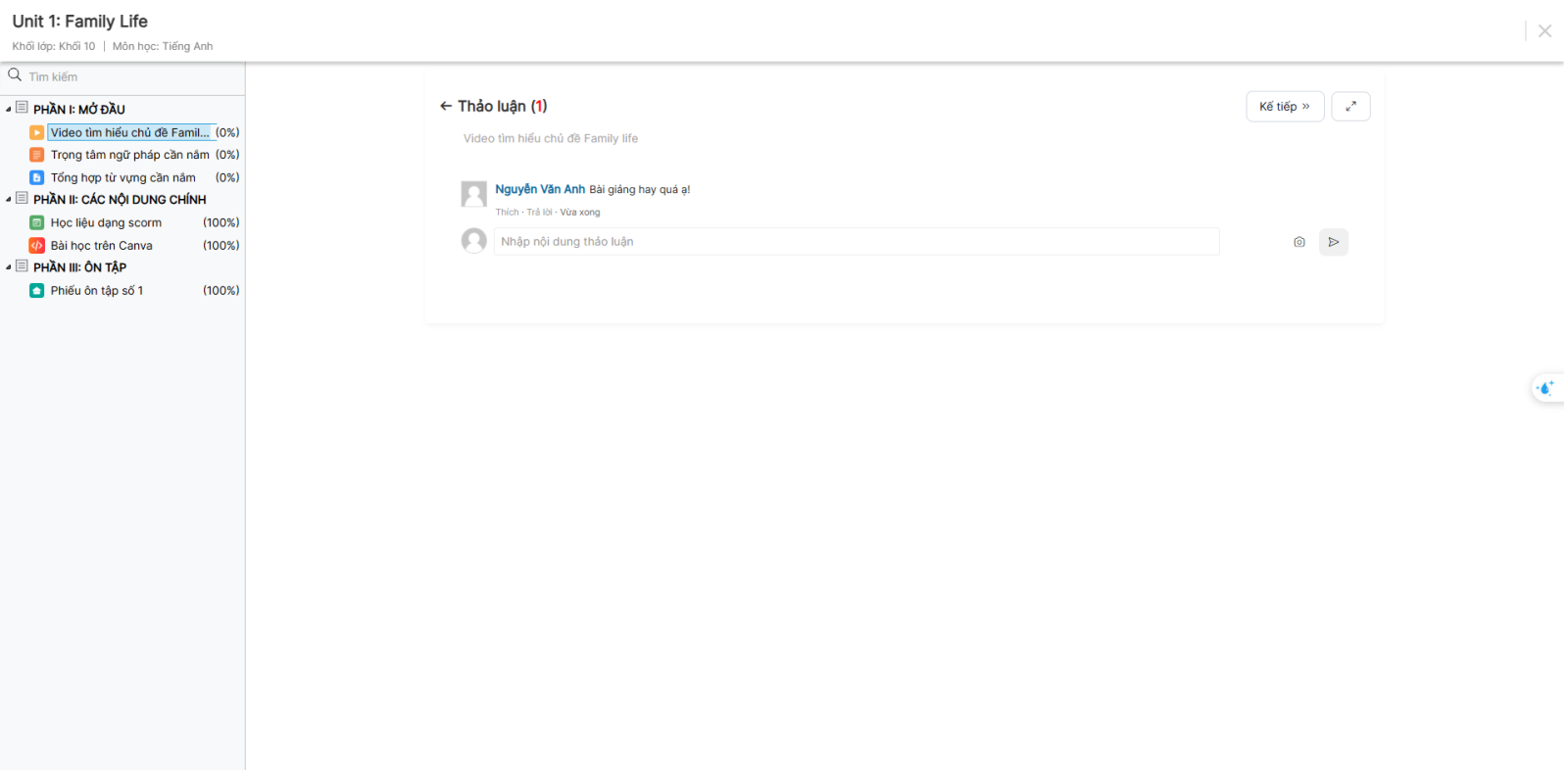 Trong quá trình xem bài giảng của giáo viên, học sinh có thể nhấn vào tab Thảo luận để đặt câu hỏi hoặc trao đổi với giáo viên và các học sinh khác.