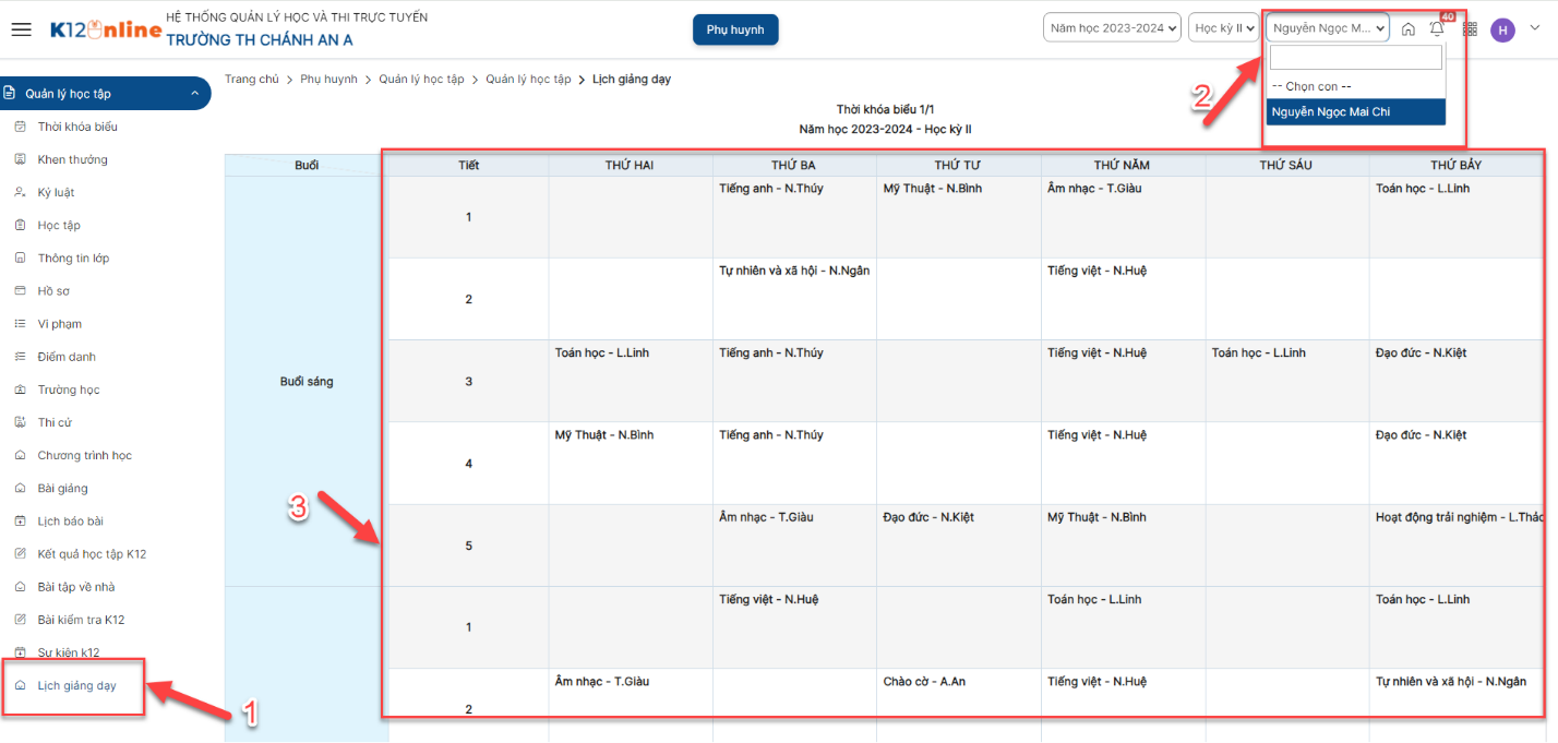 - Bước 3: Chọn menu Lịch giảng dạy và chọn con để xem lịch học