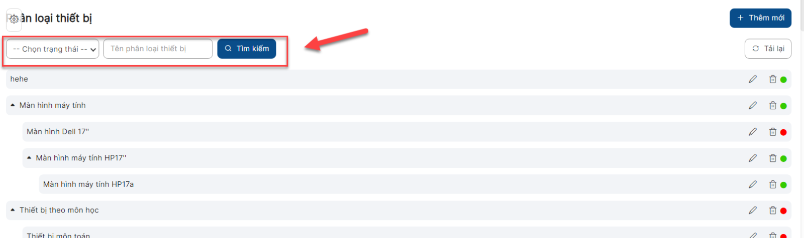 Bước 1: Trên màn hình danh sách> Tại vùng tìm kiếm: nhập tiêu chí tìm kiếm > Click button Tìm kiếm để thực hiện tìm kiếm phân loại thiết bị