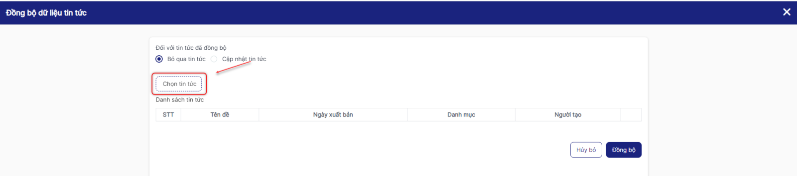 Bước 5: Click checkbox đầu các tin tức muốn đồng bộ về > click button Chọn tin tức > những bản tin được chọn hiển thị ở danh sách