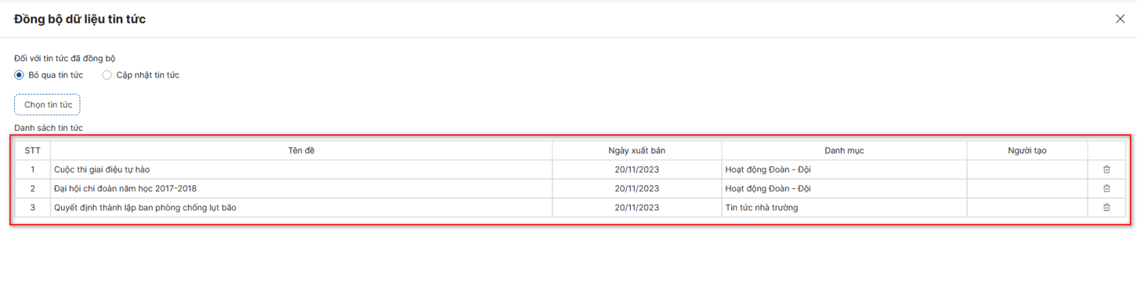 Bước 5: Click checkbox đầu các tin tức muốn đồng bộ về > click button Chon tin tức > những bản tin được chọn hiển thị ở danh sách