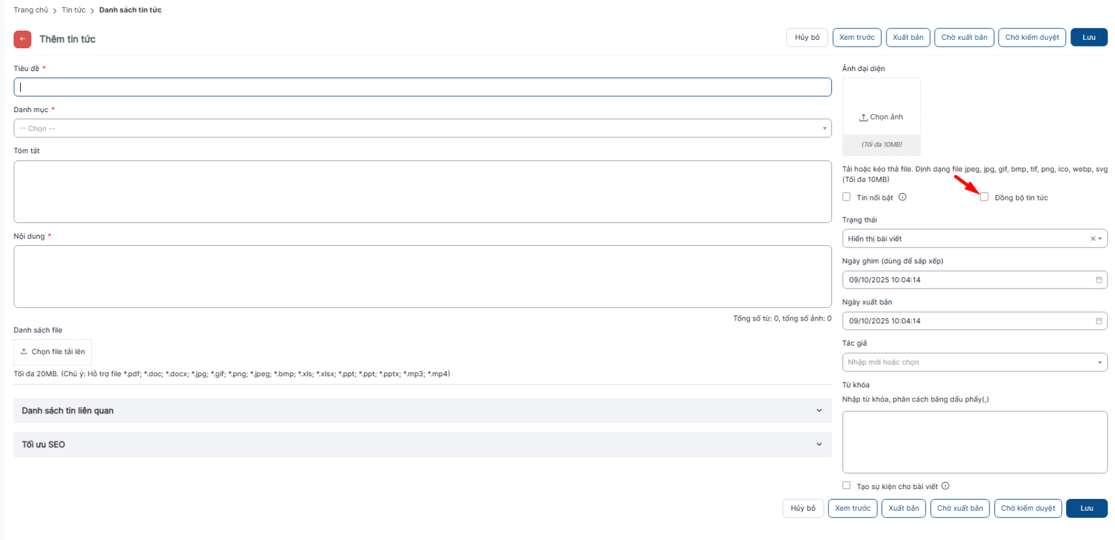 Bước 2: Tại màn hình thêm mới > tích chọn checkbox Đồng bộ tin tức , các trường khác nhập đầy đủ, hợp lệ > Nhấn Lưu để đồng bộ tin tức sang trang portal Trường tương ứng