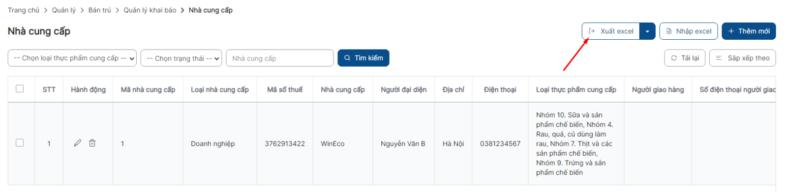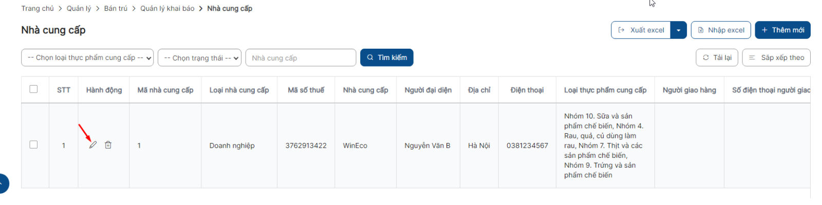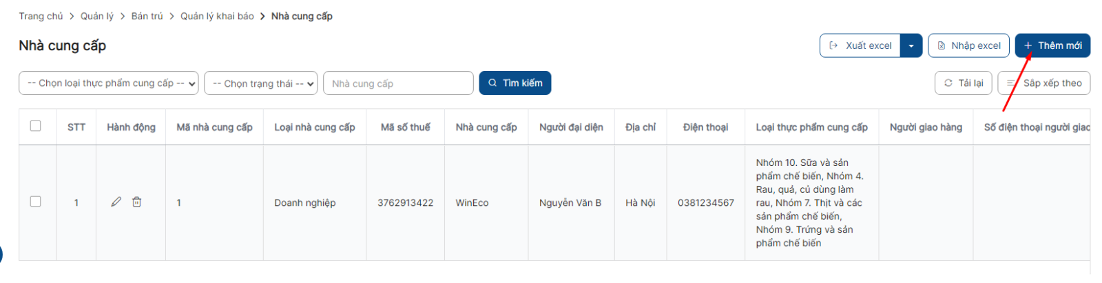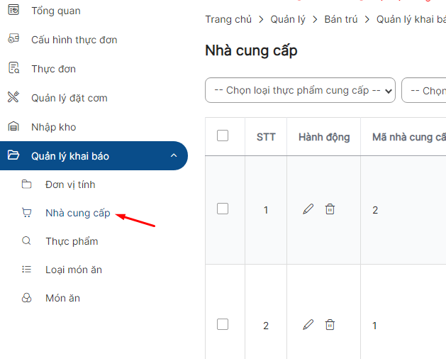 Trên thanh menu > Click Menu Quản lý khai báo > Click Nhà cung cấp