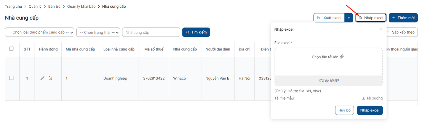 Bước 2 : Hiển thị form > Nhập đầy đủ thông tin > Click button Nhập excel thực hiện thành công