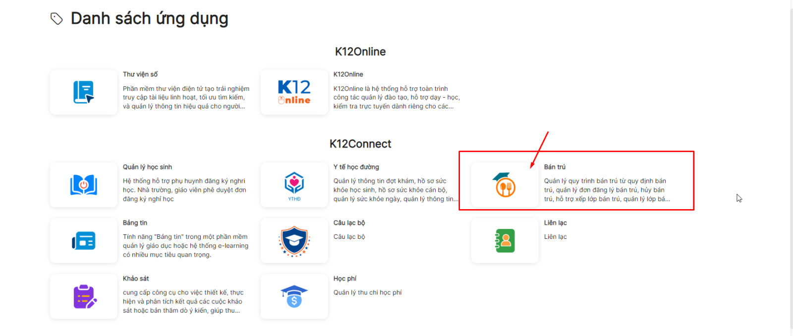 Đăng nhập vào tài khoản cán bộ cấp dưỡng > click module Bán trú