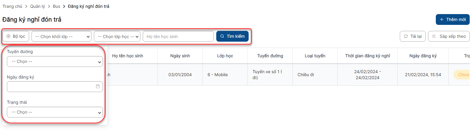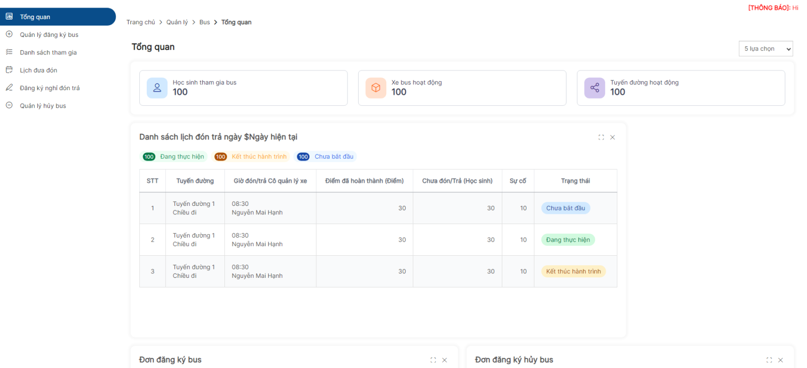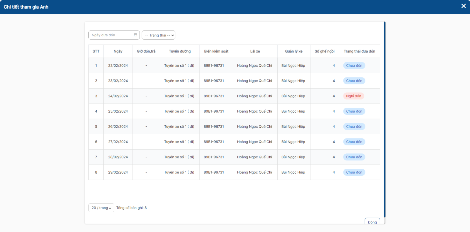 Lưu ý: Chỉ hiển thị danh sách khi học sinh đã được tạo lịch đưa đón