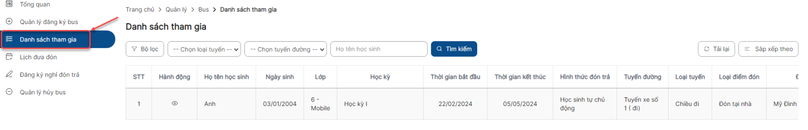 Tại đây, hiển thị danh sách học sinh đăng ký bus và đã được duyệt thuộc lớp mà giáo viên chủ nhiệm