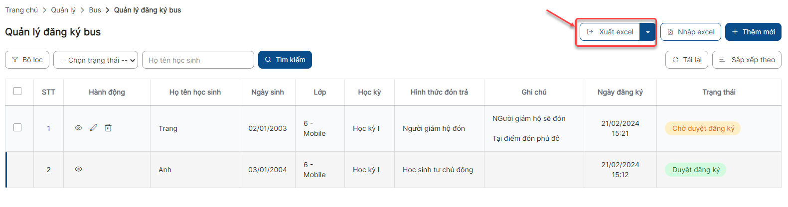 Danh sách > Click button Xuất excel > File excel được tải về