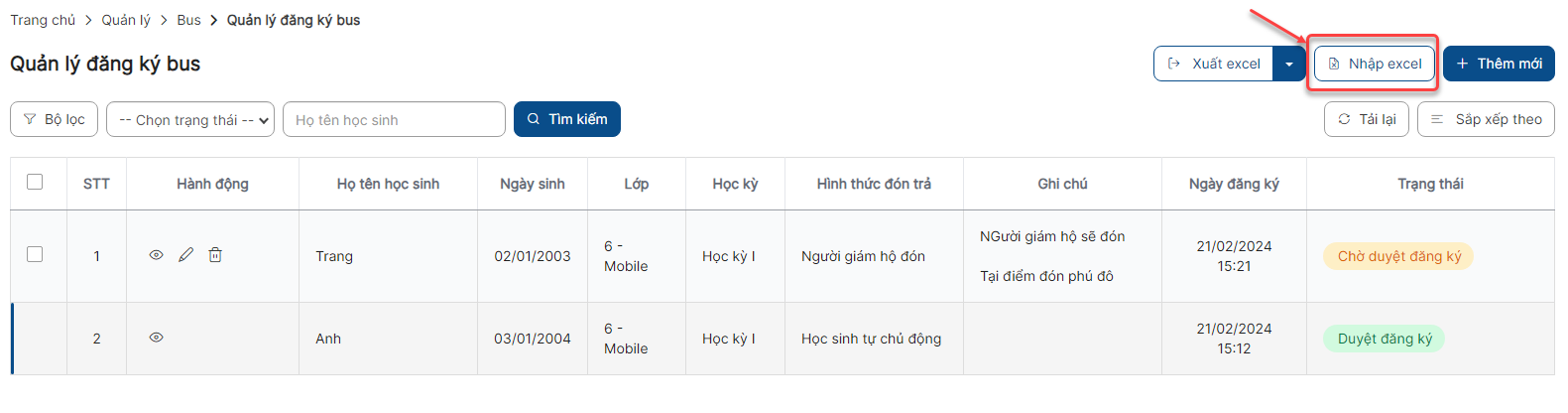 Bước 1: Danh sách > Click button Nhập excel