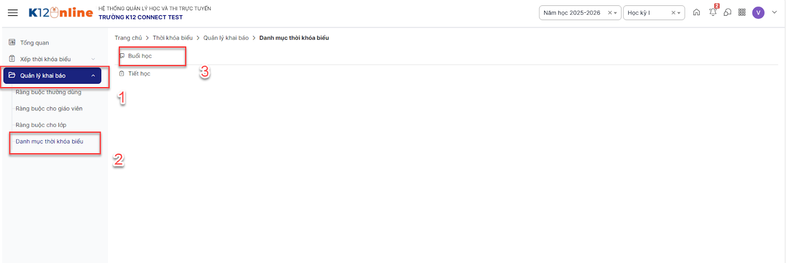 Bước 1: Trên màn hình, click menu Quản lý khai báo > Danh mục thời khóa biểu > Buổi học