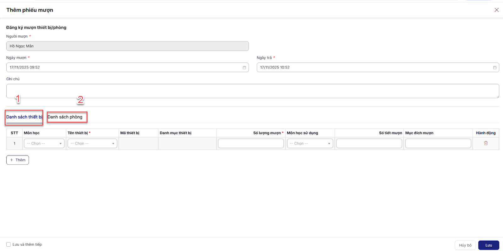 Bước 2: Trên màn hình thêm mới, thực hiện chọn thiết bị, phòng, nhập thông tin ngày mượn, ngày trả > Lưu