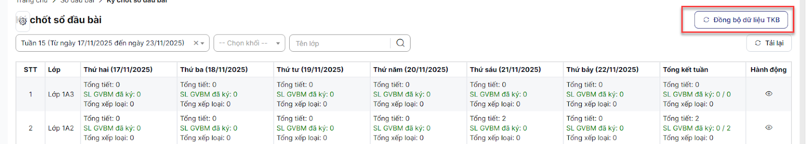 Bước 3: Dữ liệu được đồng bộ từ module TKB thành công, ẩn nút Đồng bộ dữ liệu TKB