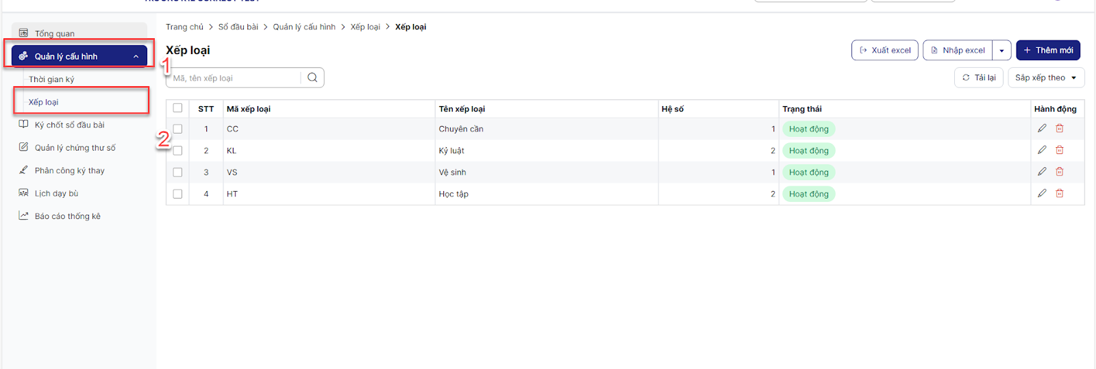 Bước 1: Trên màn hình trang chủ, click module Sổ đầu bài > click menu Quản lý cấu hình > click menu Xếp loại