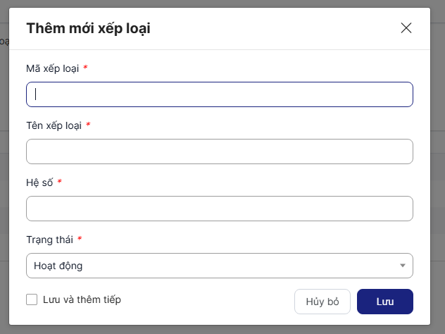 Mã xếp loại: bắt buộc nhập, chỉ nhập chữ không dấu, số, các ký tự ._-/, nhập tối đa 5 ký tự