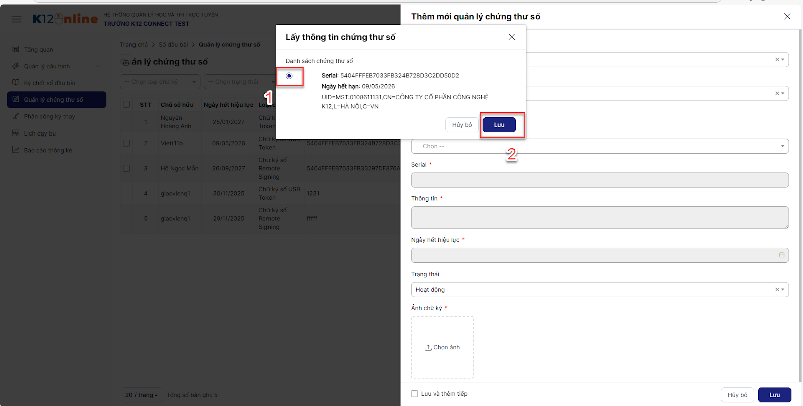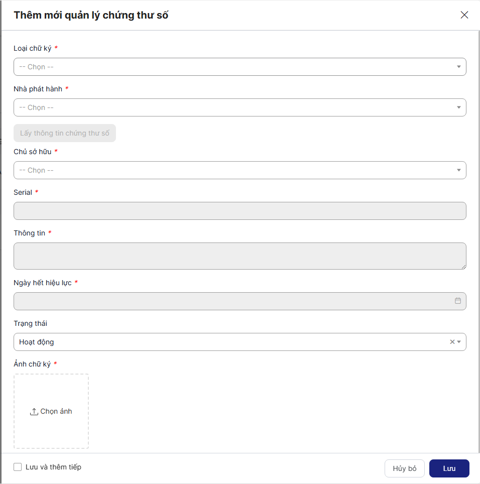 Chọn loại chữ ký và Nhà phát hành để lấy thông tin chứng thư số > chọn thông tin chứng thư số > Lưu > Hệ thống sẽ tự động fill các thông tin disable
