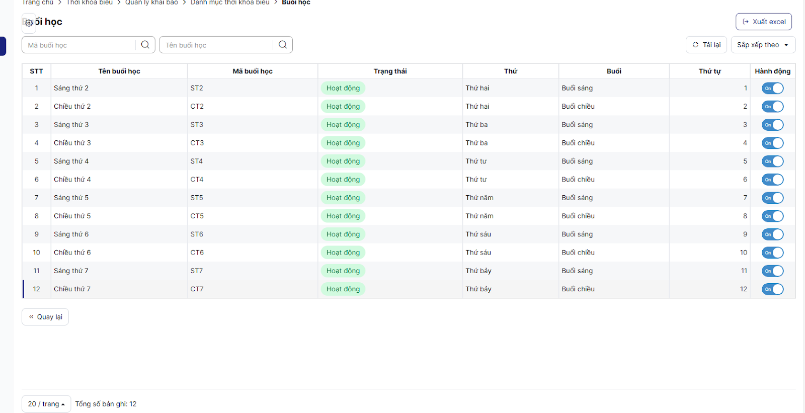 Bước 2: Trên màn hình, hiển thị danh sách Buổi học lấy từ K12home, thực hiện Bật/tắt hoạt động để hiển thị/ẩn hiển thị buổi học