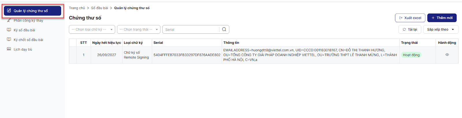 Bước 1: Trên màn hình trang chủ, click module Sổ đầu bài > click menu Quản lý chứng thư số