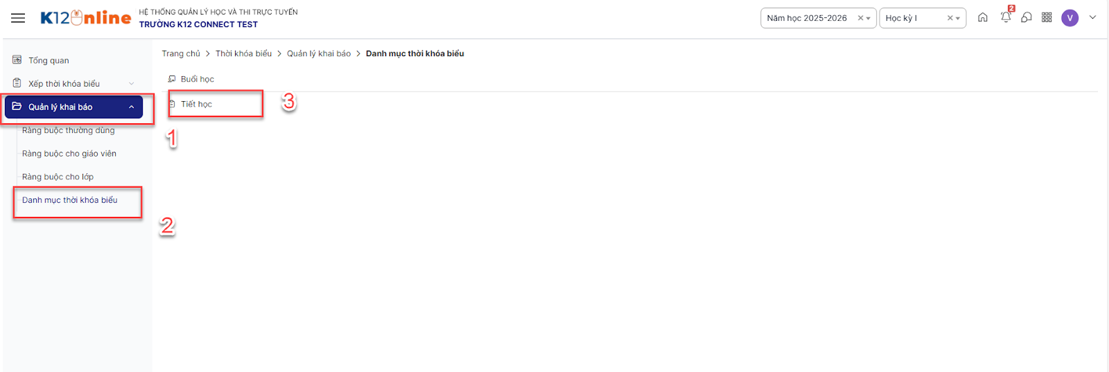 Bước 1: Trên màn hình, click menu Quản lý khai báo > Danh mục thời khóa biểu > Tiết học