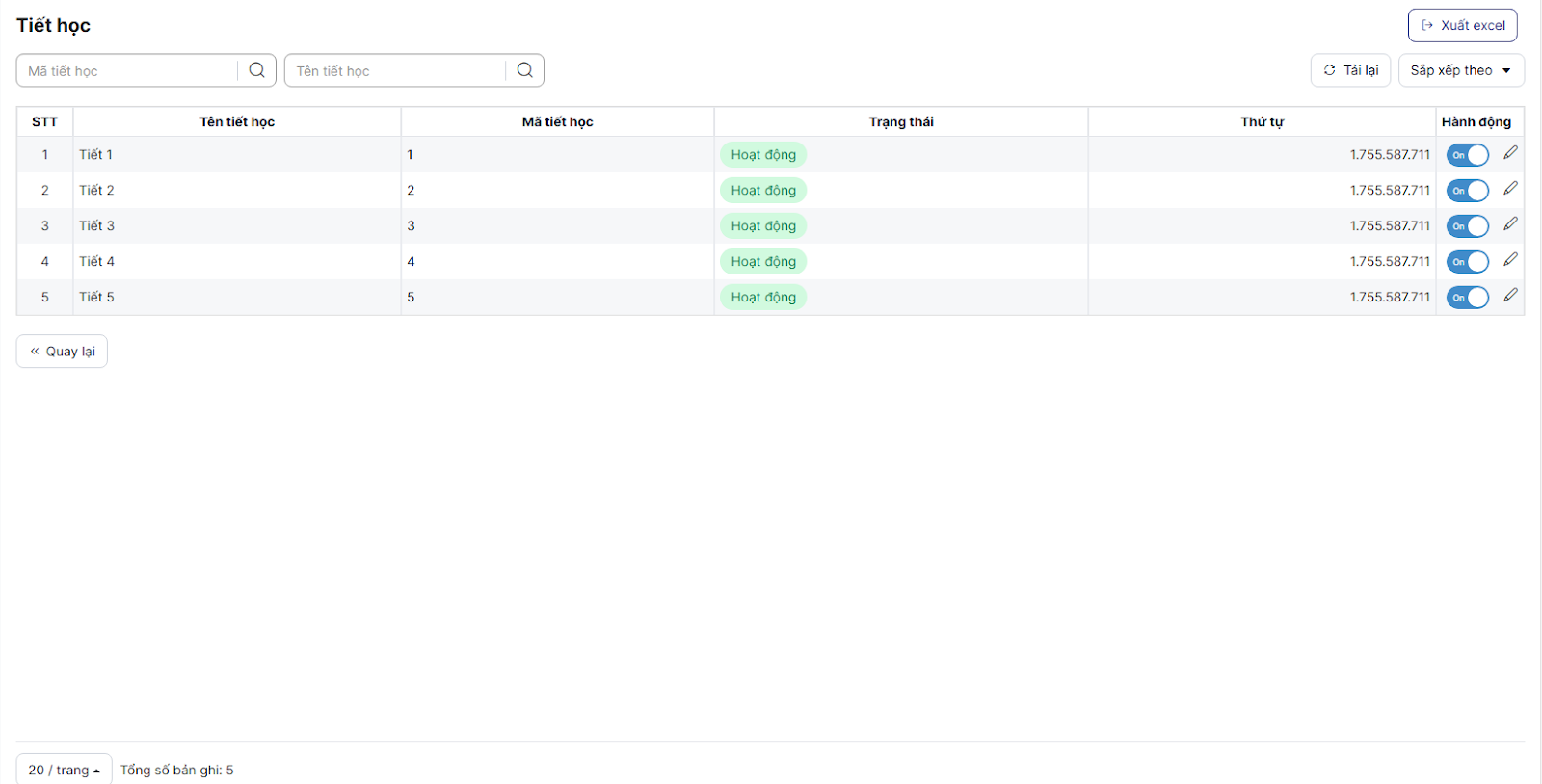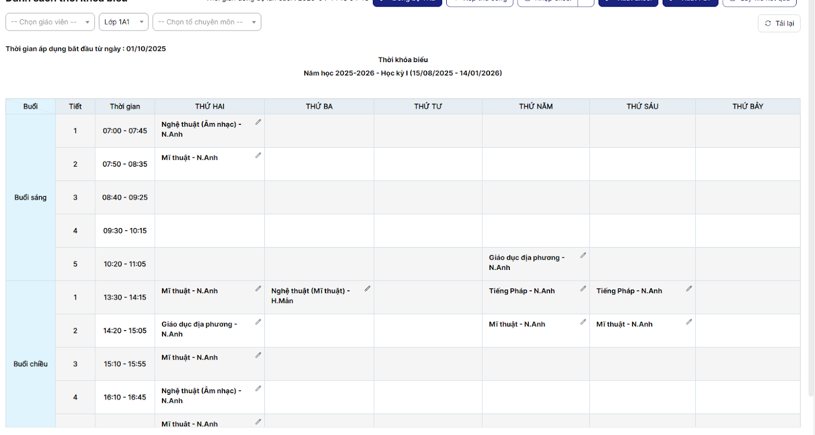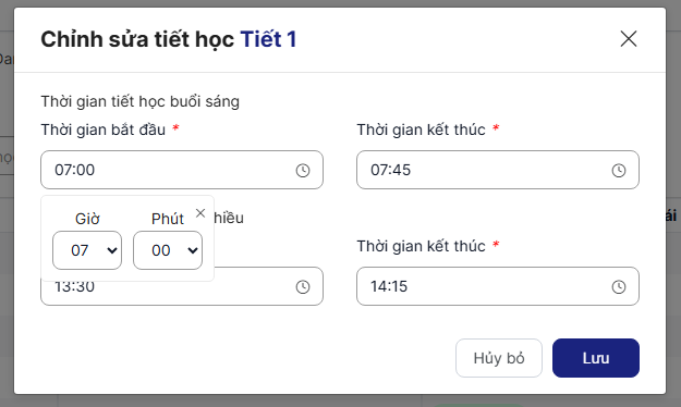 Bước 3: click icon chỉnh sửa > nhập thông tin bắt buộc, hợp lệ > Lưu để thực hiện cấu hình thời gian tiết: