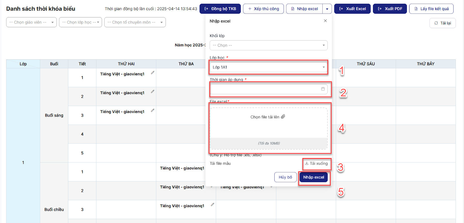 Bước 2: Click button Nhập excel > Chọn lớp học > chọn thời gian áp dụng > tải file mẫu: thực hiện xếp thời khóa biểu > tải file lên > click Nhập excel