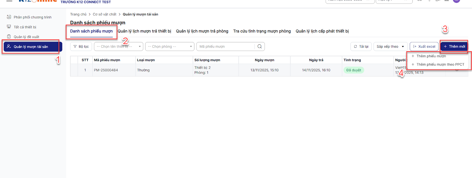Bước 1: Đăng nhập tài khoản giáo viên > Trên màn hình trang chủ, click module Cơ sở vật chất > menu Quản lý mượn tài sản > tab Danh sách phiếu mượn > click Thêm mới > chọn option bất kỳ