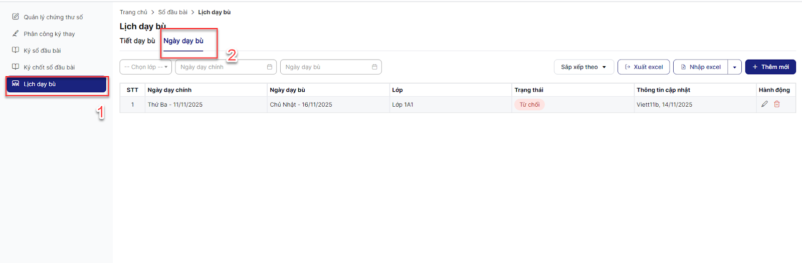 Lưu ý: Nhà trường duyệt bản ghi, bản ghi ở trạng thái Đã duyệt thì tiết học có dữ liệu Lớp - ngày dạy chính sẽ được ký, nhận xét vào ngày dạy bù.