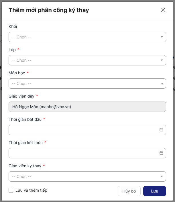 Giáo viên ký thay: bắt buộc, list danh sách giáo viên trừ giáo viên dạy đã chọn