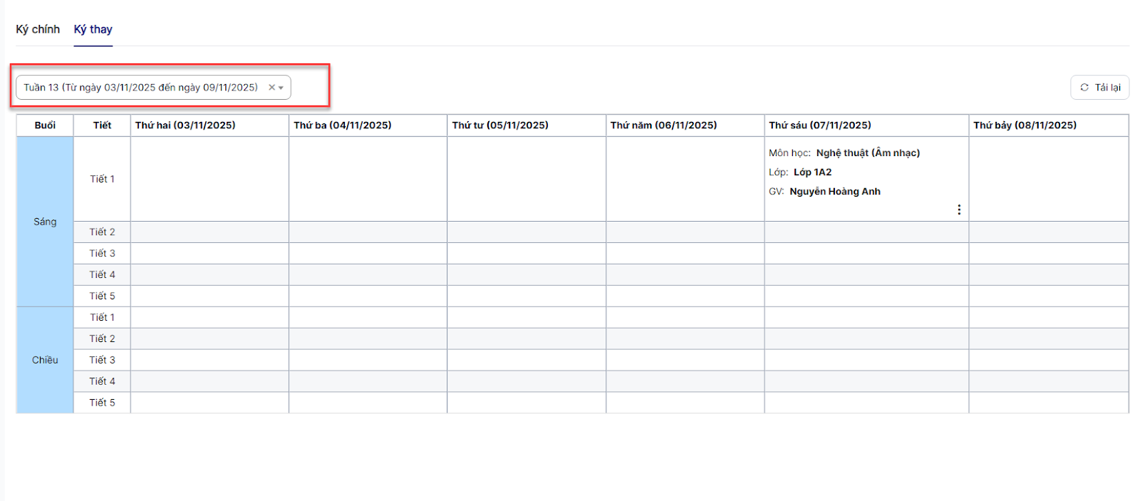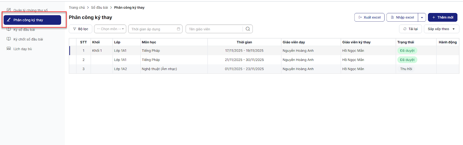 Lưu ý: Nhà trường duyệt thì các tiết học thuộc môn học, lớp học của giáo viên dạy trong thời gian phân công ký thay sẽ hiển thị ở menu Ký sổ đầu bài > tab ký thay của giáo viên ký thay. Giáo viên ký thay sẽ được phép nhận xét, ký các tiết học đó, còn giáo viên dạy không được phép nhận xét, ký các tiết học đó (vẫn hiển thị tiết học ở Ký sổ đầu bài > tab ký thay của giáo viên nhưng chỉ được xem chi tiết)