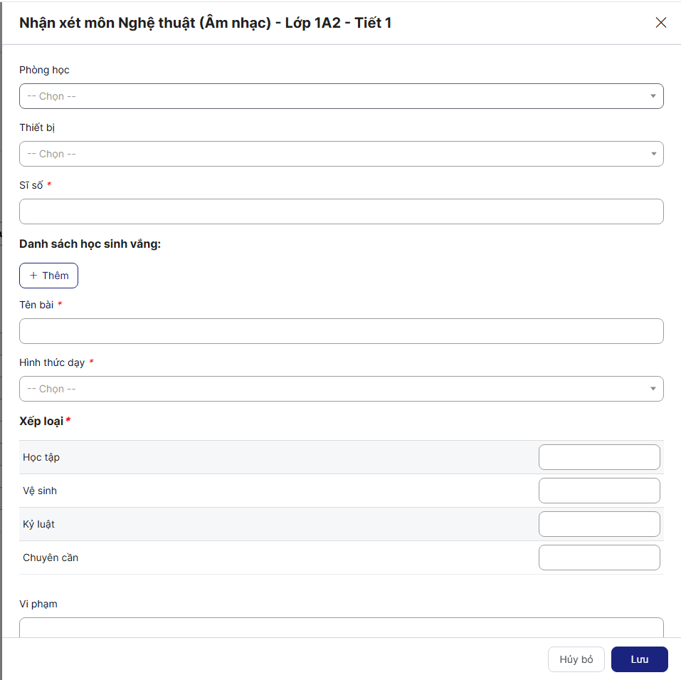 Danh sách học sinh vắng: click Thêm để chọn học sinh vắng từ danh sách học sinh của lớp