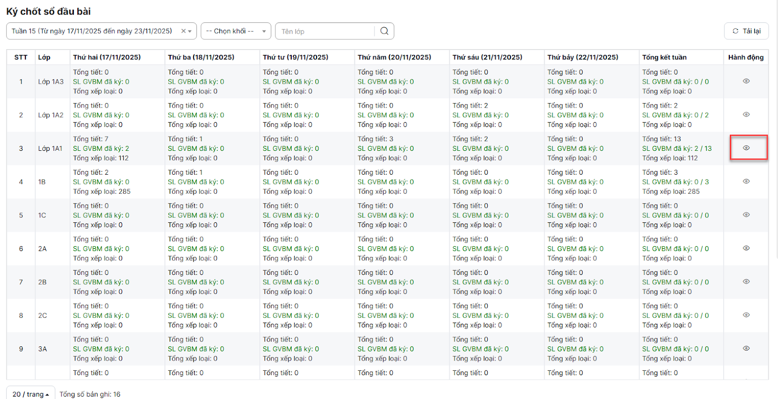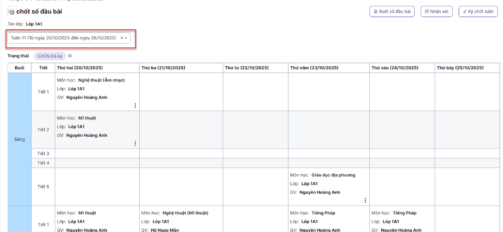 Bước 2: thực hiện ký thành công, hệ thống chuyển trạng thái bản ghi sang Nhà trường đã ký, ẩn các button Nhận xét, Ký chốt tuần