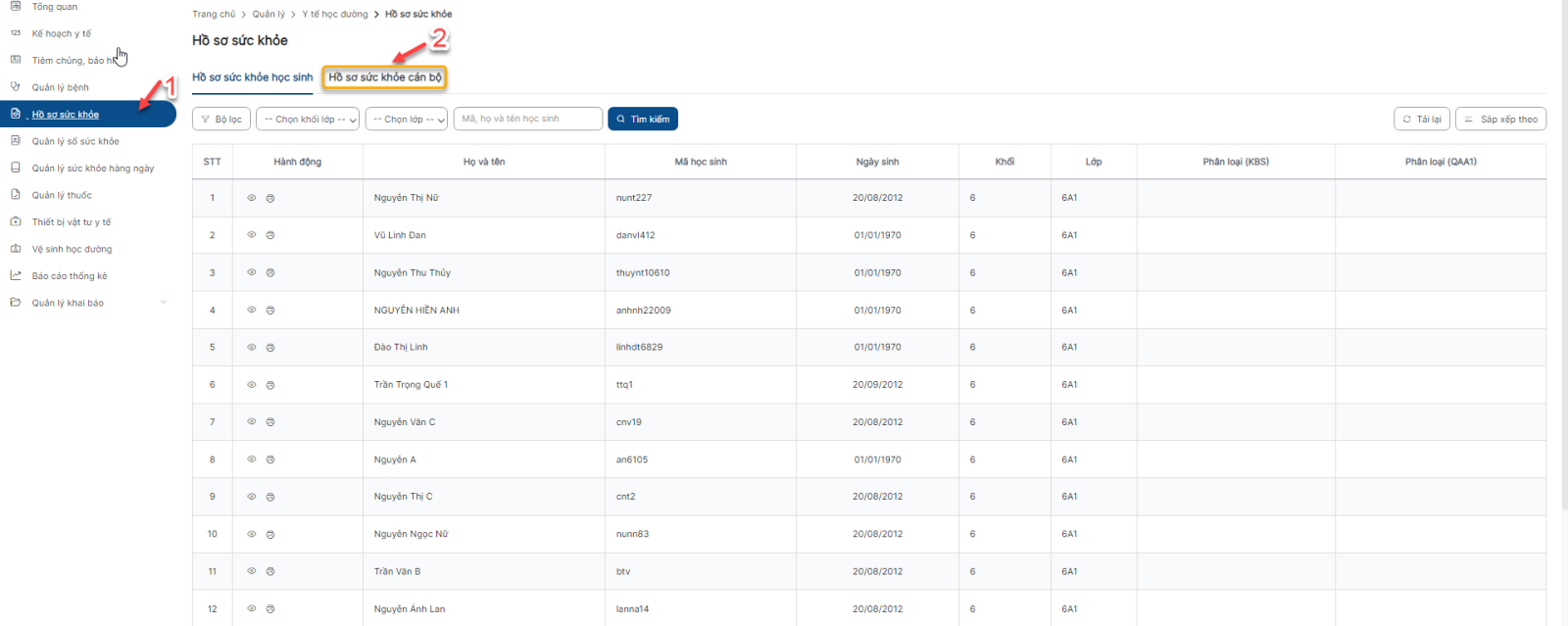 1. Xem danh sách hồ sơ sức khỏe cán bộ