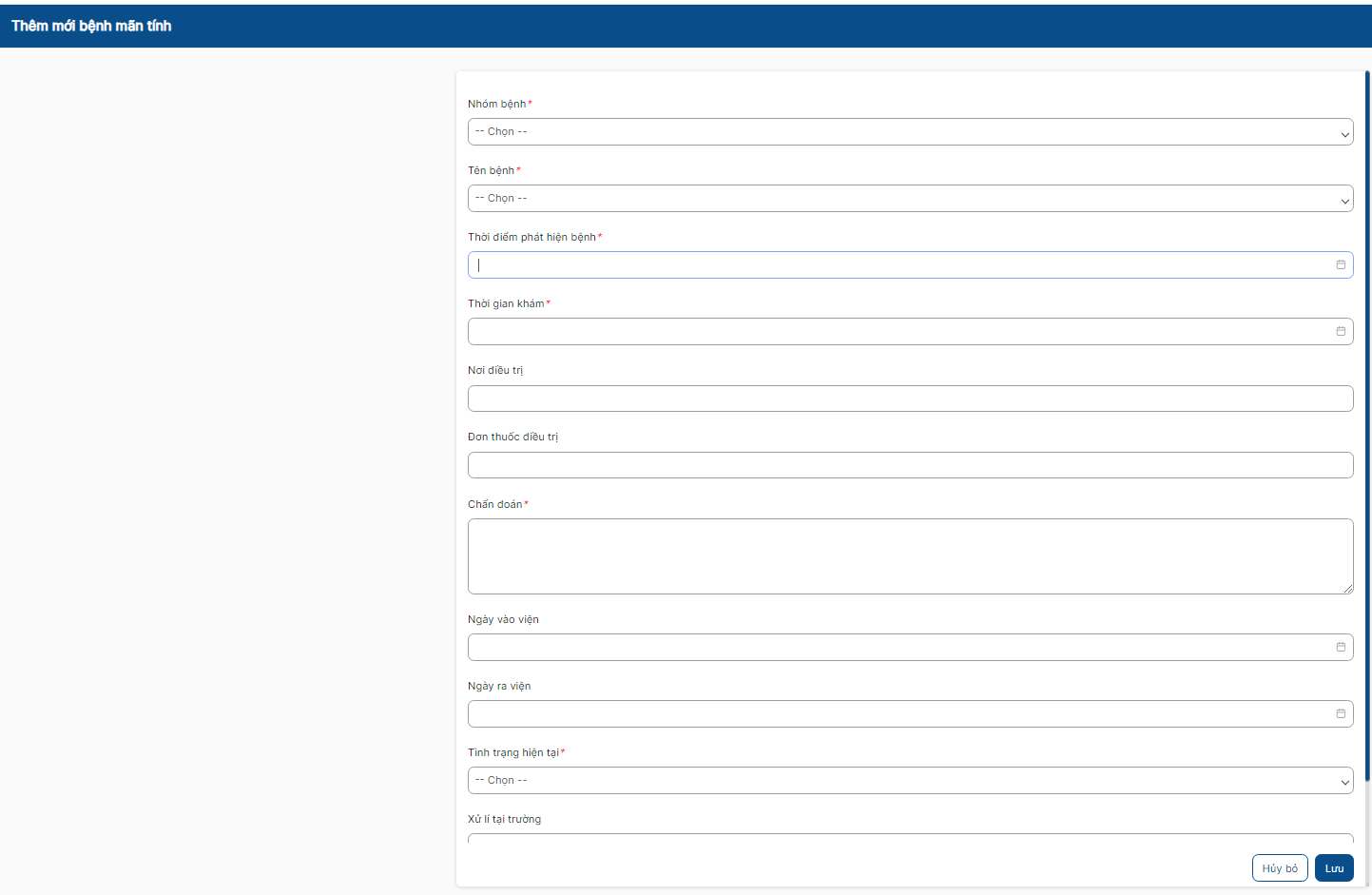 Bước 2: Nhâp/chọn hợp lệ, đầy đủ các trường bắt buộc > click lưu để thêm mới bệnh mãn tính