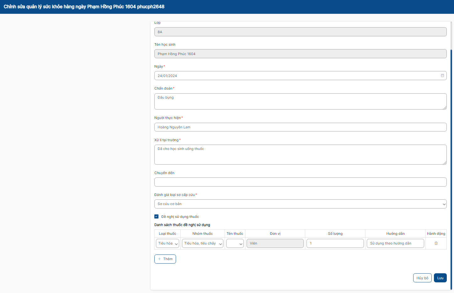 Bước 2: Nhập/Chọn hợp lệ , đầy đủ các trường dữ liệu bắt buộc > click lưu để chỉnh sửa sức khỏe ngày